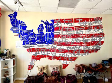 This giant wooden jigsaw puzzle of the United States of America measures 15' x 9'. It is a hanging art installation that links the United States together like a mesh net giving space between the individual states allowing for their independence and freedom within the piece as a whole. This is the perfect metaphor for the butterfly effect. Everything we do affects the whole. We are all connected.